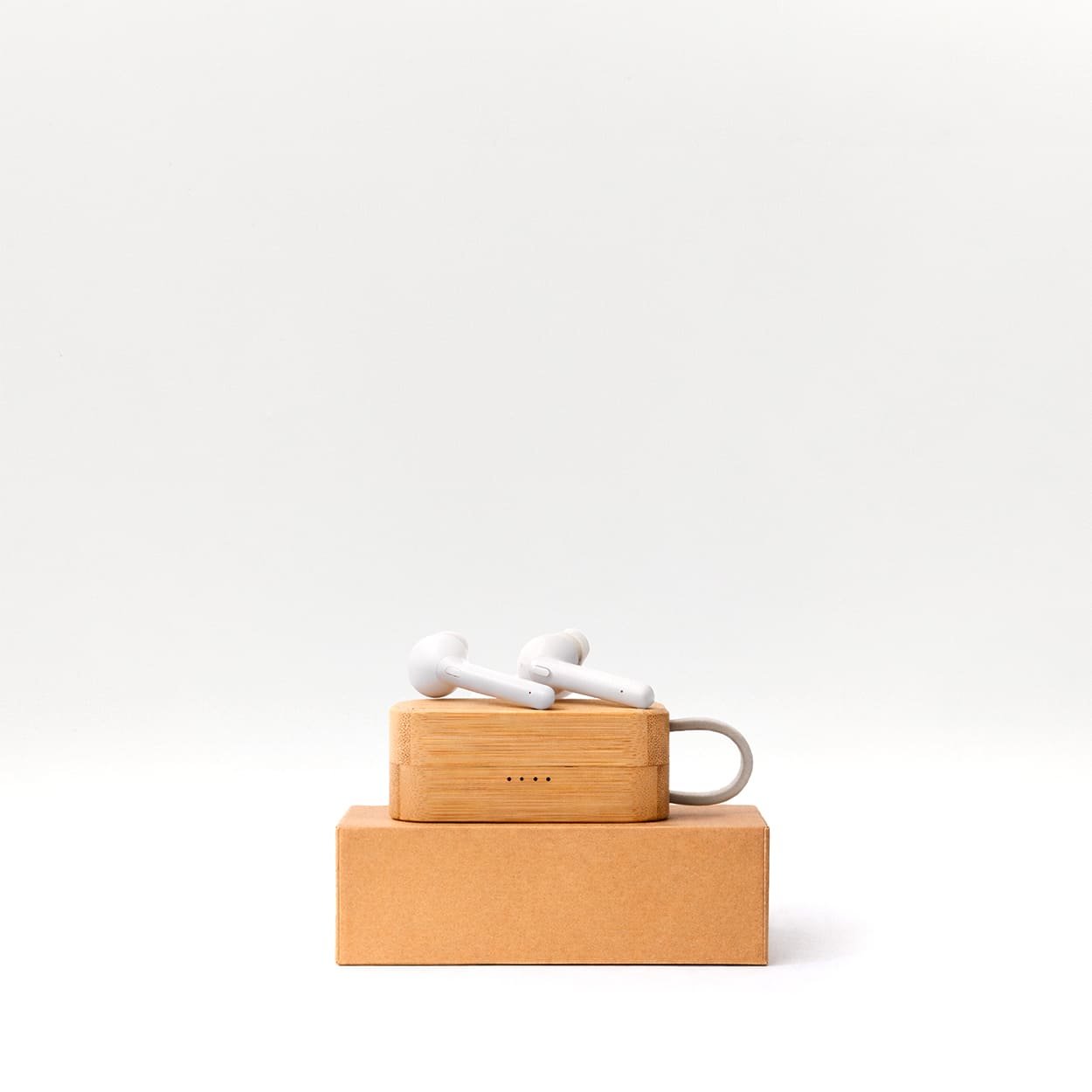 Estos auriculares inalámbricos tienen micrófono incorporado y estuche de carga en bamboo y silicona gris, combinando tecnología y diseño sustentable.