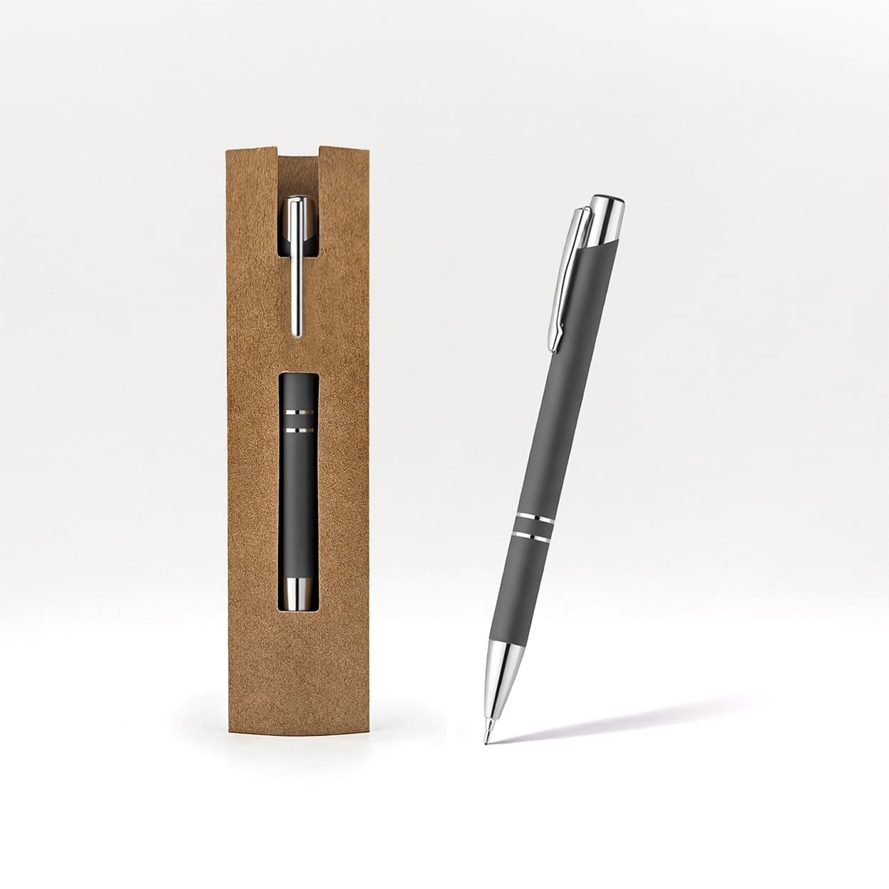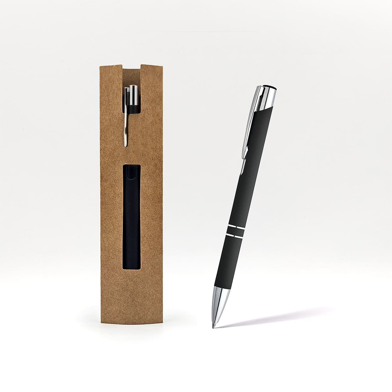 Está fabricado en aluminio con acabado en goma (rubber), lo que le da una textura suave y un buen agarre al escribir. Tiene clip metálico, mecanismo retráctil y tinta negra.