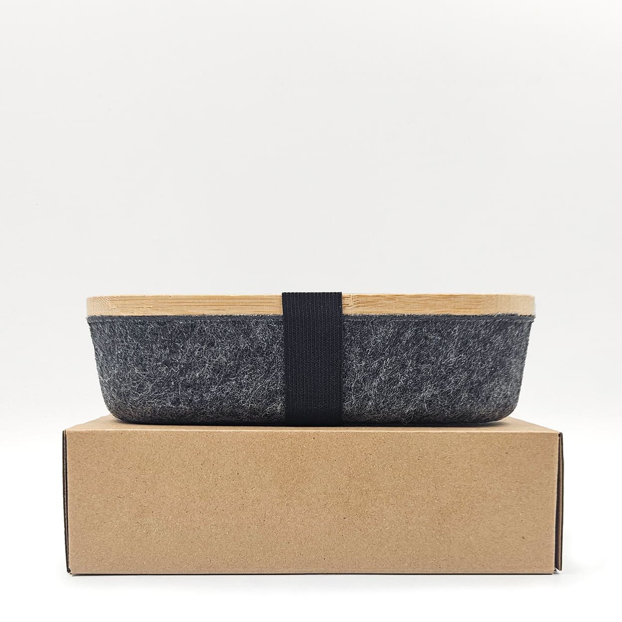• Estuche portaobjetos en fieltro RPET reciclado con tapa de bambú natural que funciona también como soporte de celular.