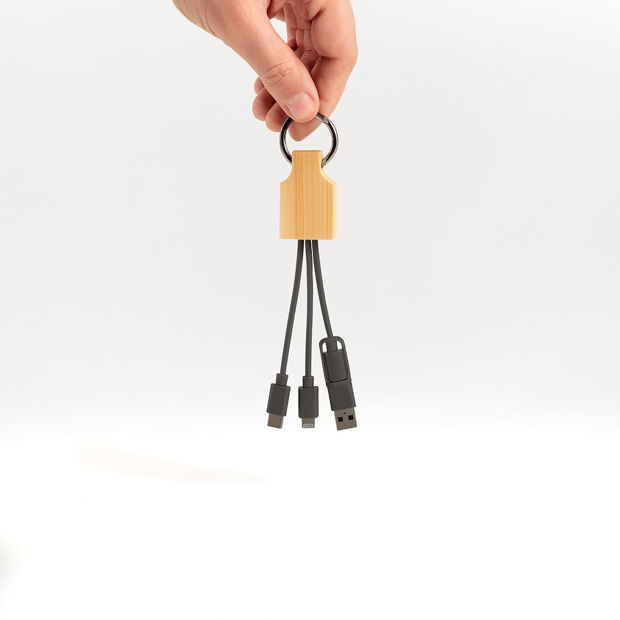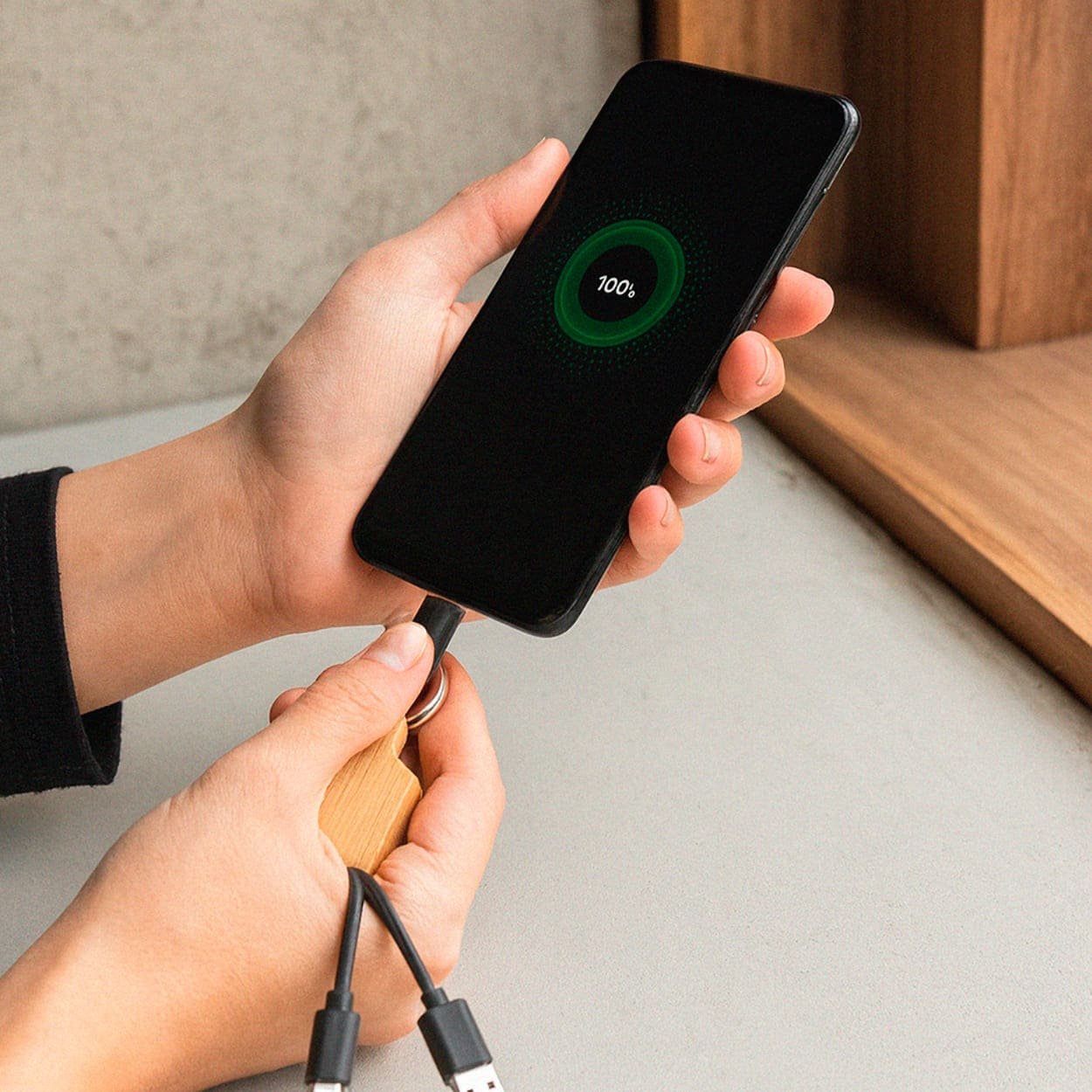 Tiene 12 cm de largo y está pensado para llevar siempre encima. Incluye entrada Tipo C con adaptador USB A y dos salidas: Micro B y Lightning,