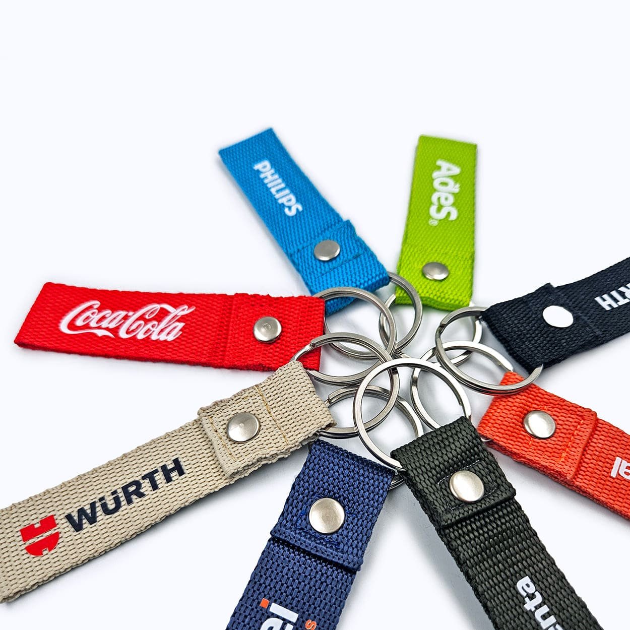Tiene una superficie amplia para aplicar logos full color, cinta de 25mm, remache metálico y elegante argolla plana de 30mm.