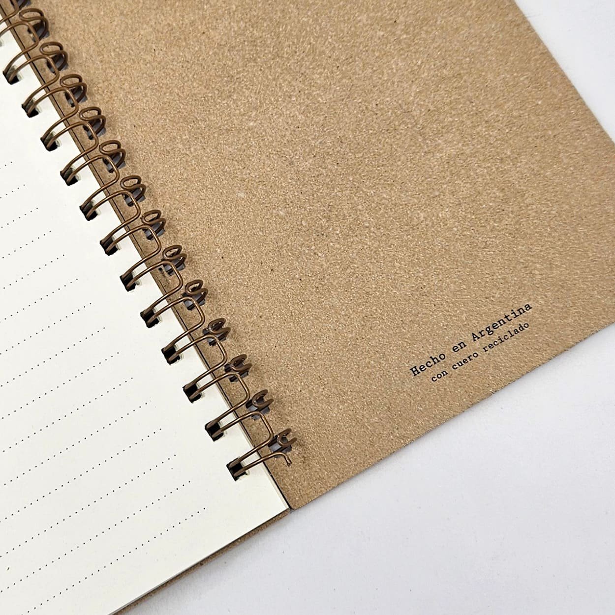 Su espiral color bronce combina a la perfección con el interior natural de las tapas y el tono cálido de las hojas. Las tapas son de cuero 100% reciclado, con hojas dot line bookcel y elástico a tono. El material se fabrica recuperando descartes de cuero, colaborando a eliminar los residuos del sistema desde el diseño y está Hecho en Argentina.