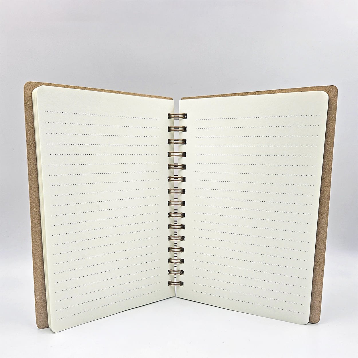 Cuaderno A5 calidad Premium, con un diseño elegante y una textura única. Su espiral color bronce combina a la perfección con el interior natural de las tapas y el tono cálido de las hojas. Las tapas son de cuero 100% reciclado, con 80 hojas dot line bookcel de 80 grs y elástico a tono.