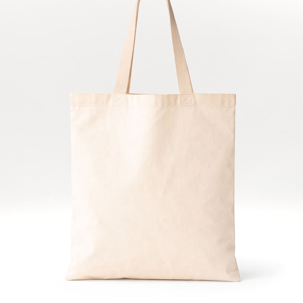 Esta bolsa reutilizable está confeccionada en algodón 100% natural (140 g/m²) y cuenta con asas largas, ideales para llevarla cómodamente al hombro.